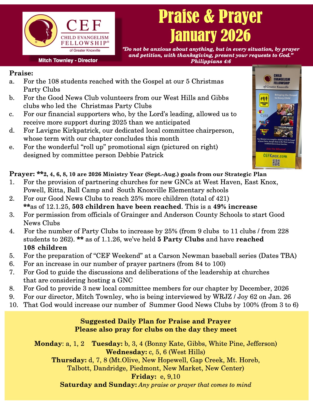 CEF cannot function without prayer. We value your prayers for God’s grace, provision, wisdom, and direction, that we serve faithfully and to His glory. We also ask you to “pray earnestly to the Lord of the harvest to send out laborers into his harvest.If you would like to be a part of our prayer team to receive a monthly prayer letter, please email us at : info@knox.boro.webservice.team with the subject: Prayer Team.